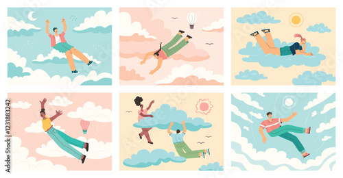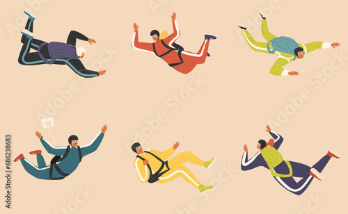 Mužské a ženské výsadkářské postavy na sobě oblek plovoucí ve vzduchu bez izolované sady padáku. Profesionální parašutisté parašutismus vektorové ilustrace