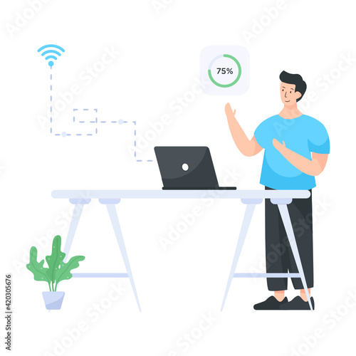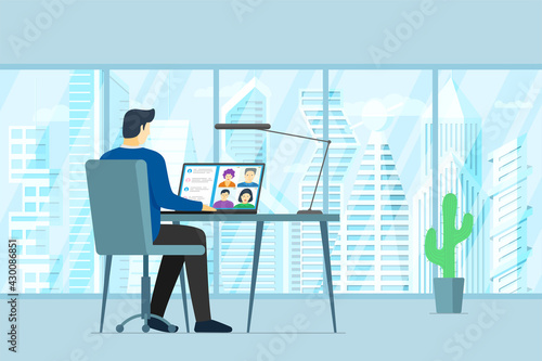 Muž na volné noze pracuje vzdáleně od svého stolu. Vektorová ilustrace konceptu na volné noze v designu plochého stylu. Domácí kancelář pracoviště. Nakupování.