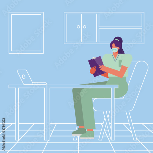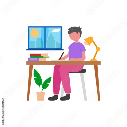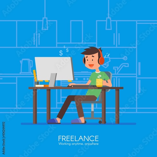 Muž na volné noze pracuje na dálku ze svého pokoje. Vektorová ilustrace konceptu na volné noze v designu plochého stylu. Domácí kancelář pracoviště. Nakupování.
