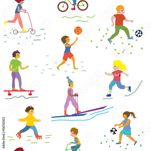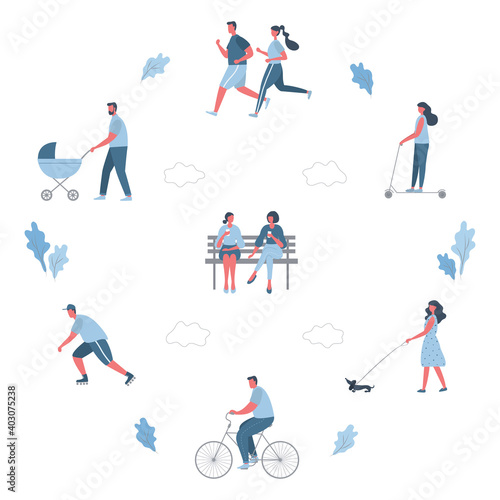 Muž a žena postavy cvičení a sport doma i venku. Vektorové ilustrace sada lidí cvičení, dělá jógu a běh. Protahování, jízda na kole, bruslení, vzpírání.