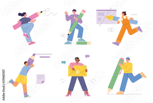 Postavy muže a ženy sklízejí sklizeň a výsadbu zeleniny ve farmářském gradenu. Vektorová ilustrace sada zemědělců pracují v zemědělství zemědělské oblasti. Krmení zvířat, setí rostlin, sklizeň.