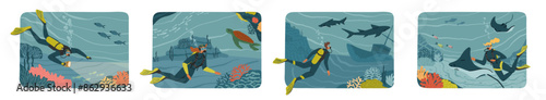 Muž a žena pár na sobě aqualung a oblek se těší romantické potápění plavání spolu pod vodou sledování moře oceán obyvatel a korálový útes vektorové ilustrace