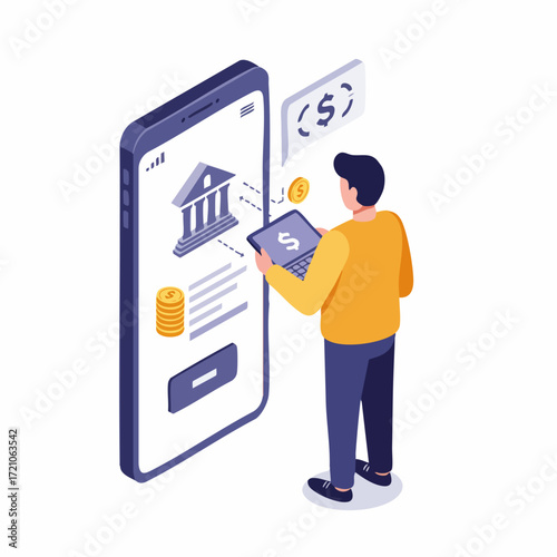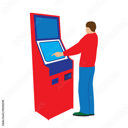 Muž nákup jízdenky na metro v ATM booth vektor. Osobní a automat izolovaných na bílém pozadí. Vybavení městského metra