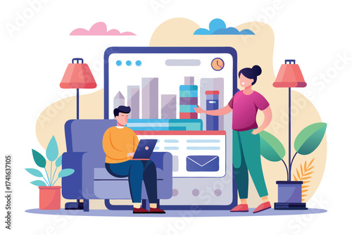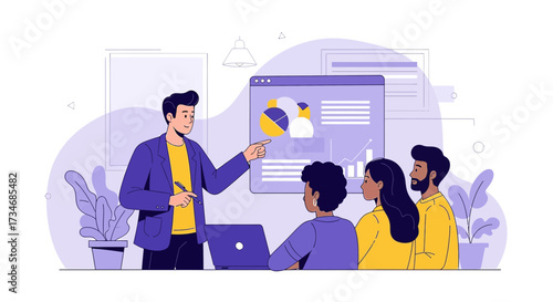 Muž kupuje nový mobilní telefon. Prodejce ukazuje smartphone zákazníkovi, ploché vektorové ilustrace. Interiér telefonního obchodu.