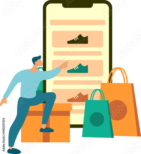 Muž nákup boty v internetovém obchodě na smartphone vektorové ikony izolovaných na bílém pozadí