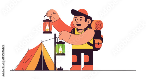 Muž horolezec charakter balení batoh pro pěší turistiku vektorové ikony izolovaných na bílém pozadí.