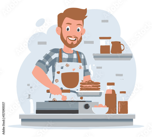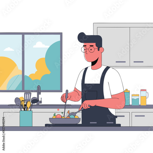 Muž vaření jídla, příprava večeře v kuchyni, ploché vektorové ilustrace. Domácí práce, domácí práce, Úklid, hobby.