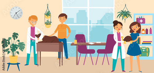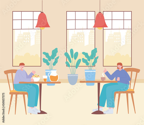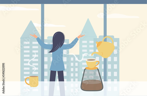 Muž visí závěsy na okno stojící na žebříku, ploché vektorové ilustrace. Domácí práce, domácí práce, Úklid.