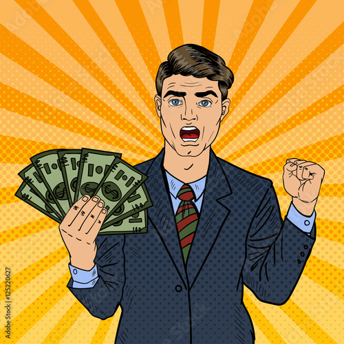 Muž drží kreditní karty vektorové ilustrace v retro pop art stylu. Nakupování s konceptem bankovních karet.