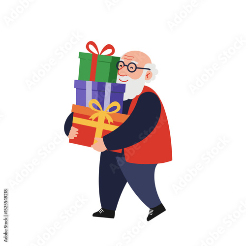 Muž má velkou dárkovou krabici. Vektorová ilustrace v retro komiksovém pop art stylu. Chlap s vánočním nebo narozeninovým dárkem.