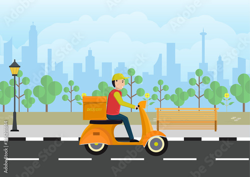 Muž v helmě Řidičský skútr na městské ulici. Vektorový plakát koncepce městské dopravy. Městská dodávka na mopedu.