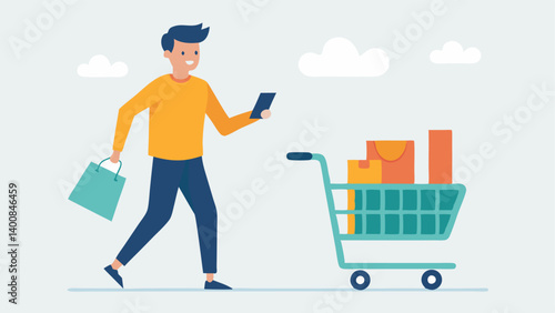 Muž v lékařské masky běží v panice tlačí nákupní košík vektorové ikony izolovaných na bílém pozadí. Koncept virové pandemie.