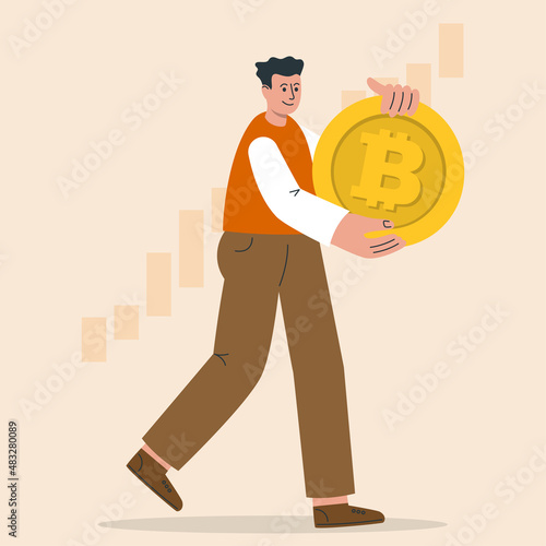 Obchodní muž horník s bitcoin vektorové ikony izolovaných na bílém pozadí. Kryptoměnová peněženka, důlní a investiční koncept