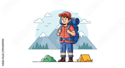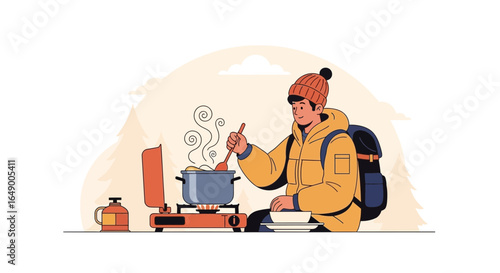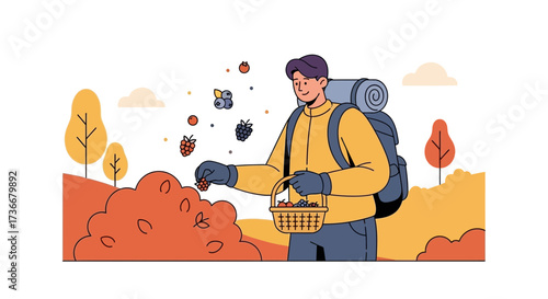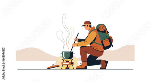 Muž balení trekking zařízení v batohu vektorové ikony izolovaných na bílém pozadí