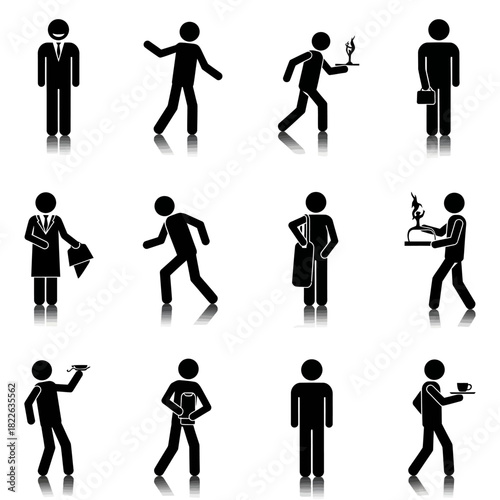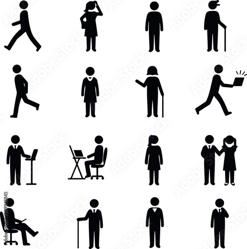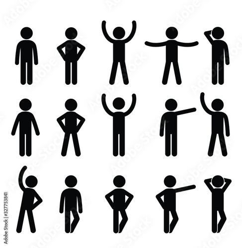 Muž držení těla piktogram a ikony set. Lidé sedí, stojí, běží, leží, mluví. Lidské tělo akční pózy a postavy. Vektorové ilustrace izolované na bílém pozadí