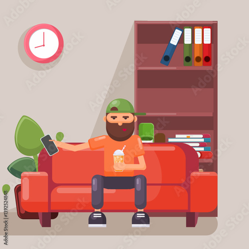 Muž sedí na lavičce v parku, čte knihu a pije kávu. Vektorová ilustrace v designu plochého stylu.