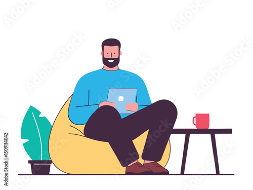 Muž sedí na záchodové míse, ploché vektorové ilustrace. Toaletní rutina.