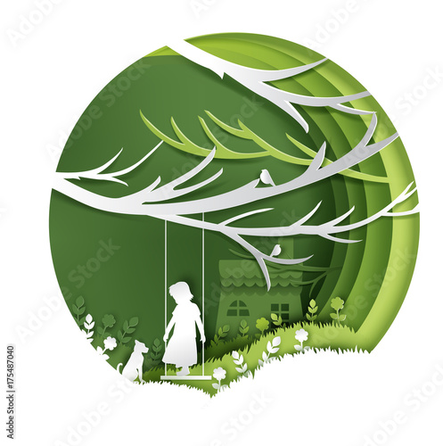 Muž cestovatel v džungli papír řez 3D vektorové ilustrace. Explorer řezání velké zelené listy deštného pralesa stromu hledají bezpečnou cestu. objevování, průzkum, turistika, dobrodružná turistika a cestování
