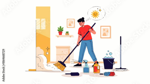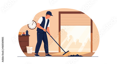 Muž vysává podlahu ve svém pokoji. Koncept úklidové služby vektorové ilustrace. Chlap čištění domů obývací pokoj.