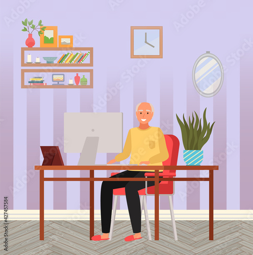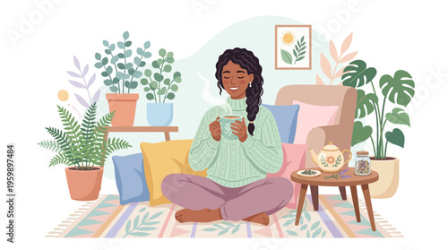 Muž oteplování zabalené do deky pití čaje nebo kávy z šálku, zatímco sedí na křesle nad domácí obývací pokoj interiér s kočkou