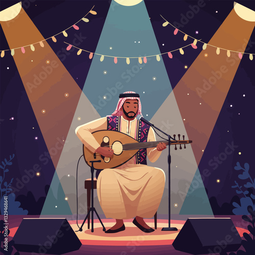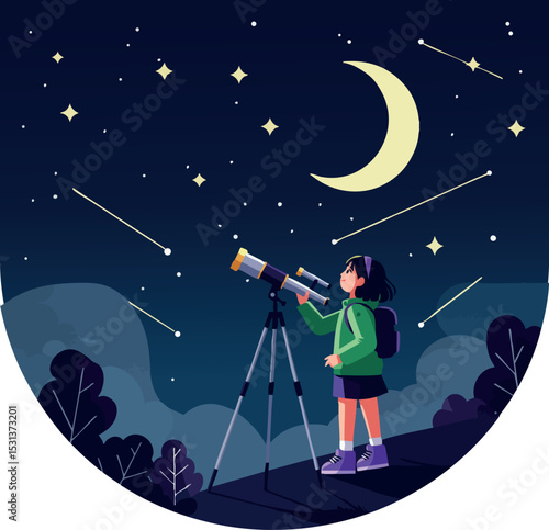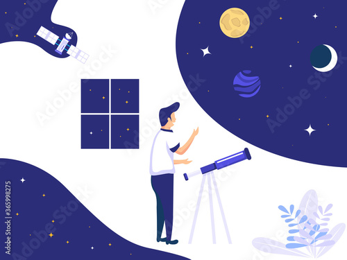 Mladý muž pozoroval dalekohledem na noční obloze, když stál na střeše domu. Vektorové ilustrace v plochém stylu. Astronomie hobby concept design element.