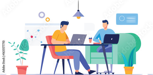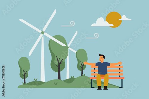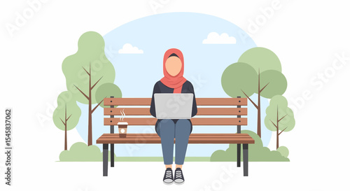 Muž s notebookem pracuje v parku vektorové ilustrace. Mladý kluk sedí na lavičce pomocí počítače pro práci na volné noze, vzdálená práce nad veřejnou Zahradní krajinou. Student, pracovník nebo turista s pc