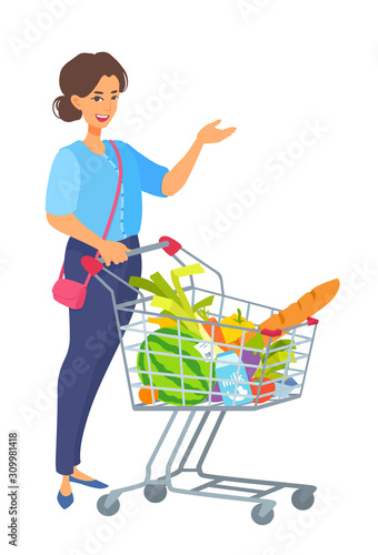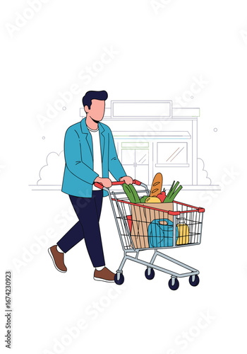 Muž s nákupním vozíkem plným domácích spotřebičů, jako je lednice, pračka, reproduktor, vysavač, ploché vektorové ilustrace. Koncept nákupu elektroniky.