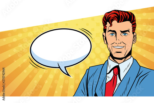 Muž s řečovou bublinou ve stylu retro pop art. Komiksová vektorová ilustrace.