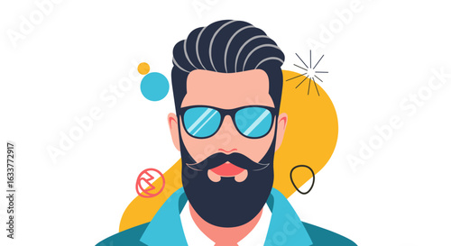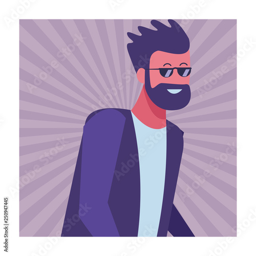 Muž se slunečními brýlemi s nápisem dolar. Vektorová ilustrace ve stylu retro pop art. Koncept obchodního úspěchu. Boháč myslí na peníze.