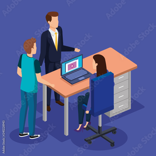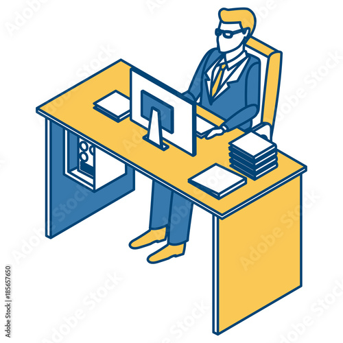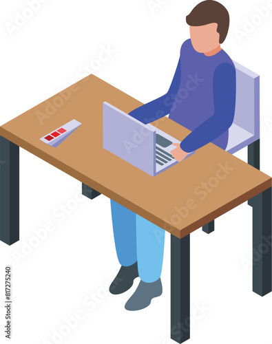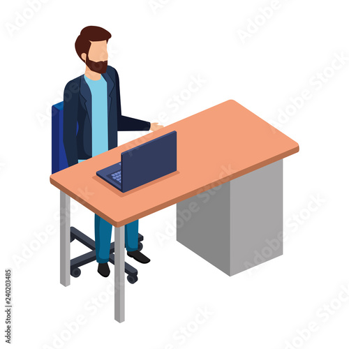 Muž pracující v počítačovém vektoru. Ikona vzdálené práce. Návrhář na volné noze, podnikatel na pracovišti izolovaných na bílém pozadí