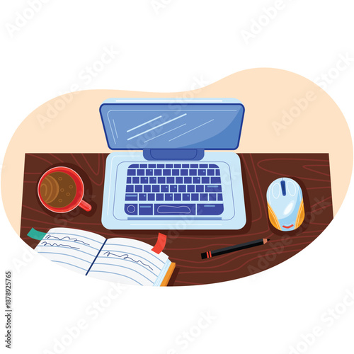 Muž pracuje s notebookem v domácí kanceláři. Obchodní koncepce ilustrace. Vektor web design šablony. Otevřete notebook, kávu a poznámky na stole. Interiér kanceláře.