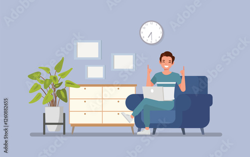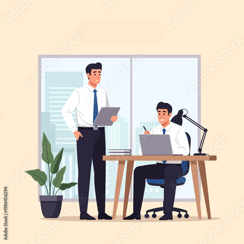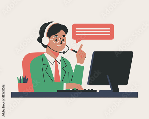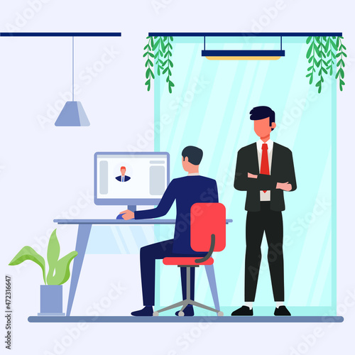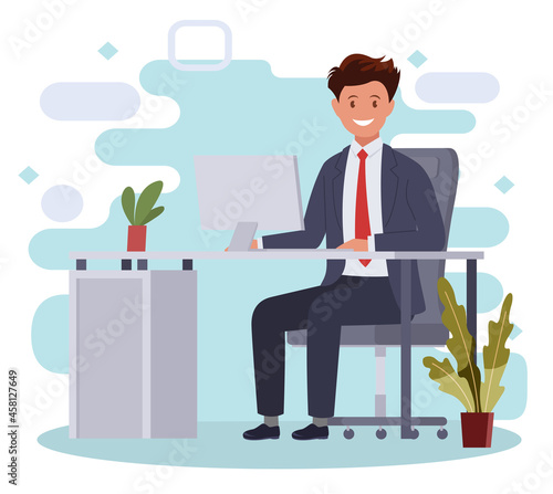 Manažer nebo administrativní pracovník sedí na židli a pracuje na počítači. Vektorová ilustrace obchodního konceptu v designu plochého stylu.