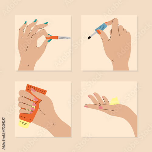 Ruční manikúra set, vektorové izolované ilustrace. Kosmetické ošetření rukou a nehtů, hygiena. Nástroje a příslušenství pro manikúru. Studio Nail art, služby lázeňského salonu.