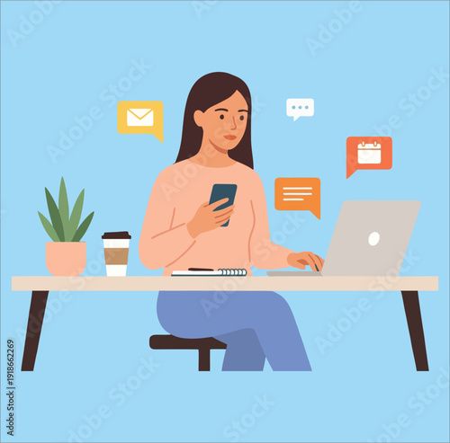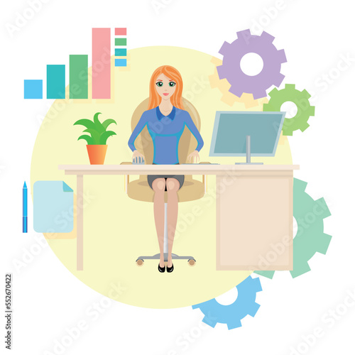Mladá žena sní o své novorozené dítě, zatímco sedí u kancelářského stolu se zavřenýma očima, vektorové ploché styl designu ilustrace. Mateřství, mateřství, koncepce plánování těhotenství.