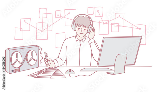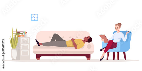 Maso obchod, ploché vektorové ilustrace. Prodavač stojící u pultu lednice s čerstvým vepřovým, hovězím, klobásou. Farmářský trh s potravinami. Řeznictví. Supermarket, obchod s potravinami maso sekce, oddělení.