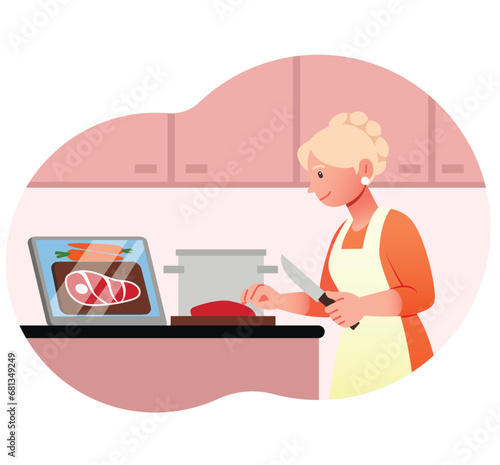 Maso obchod, ploché vektorové ilustrace. Prodavač stojící u pultu lednice s čerstvým vepřovým, hovězím, klobásou. Farmářský trh s potravinami. Řeznictví. Supermarket, obchod s potravinami maso sekce, oddělení.