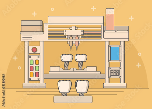 Lékařská 3D tiskárna vector. Tisk a prototypování zubních korunek v laboratorní ilustraci. Modelování zubních protéz pro náhradu těžce poškozených zubů. Stomatologie a koncept 3D tisku