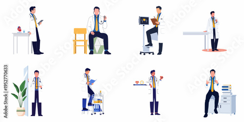 Lékařští specialisté mužské a ženské postavy vektorové ploché izolované ilustrace. Lékaři vyšetřující pacienty lékařskými nástroji, zdravotní sestry, nemocniční personál, laboratorní asistenti v bílých pláštích. Koncepce medicíny