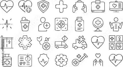 Vektorový bezproblémový vzor s lékařskými symboly, ikonami. Zdravotní péče medicína pozadí, balicí papír textura tenká linie umění plochý styl designu.