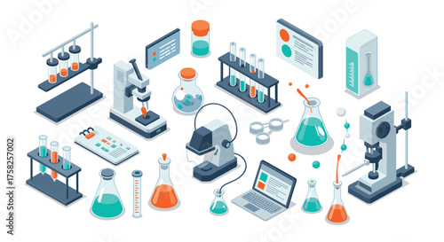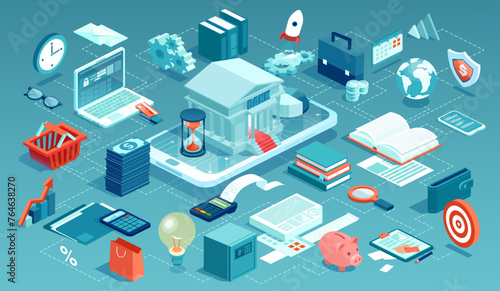 Medicine online izometrický vývojový diagram, vektorové ilustrace. Smartphone, lékárna obchod, lékař lékárník sloužící zákazníkovi na přepážce, léky na předpis, léky pro pacienty. Online lékárna, drogerie