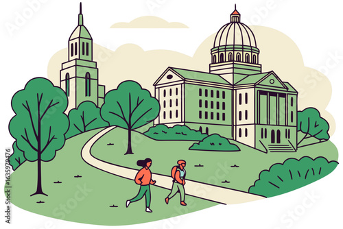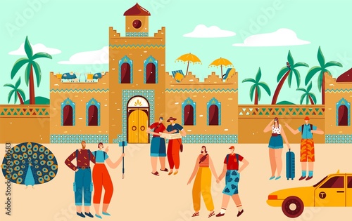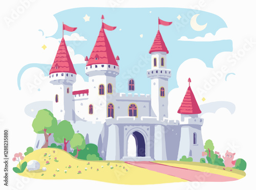 Středověká scéna s obrněnými rytíři na koních s kopími blížícími se k hradu stojícímu na kopci. Vektorové ploché styl designu ilustrace.