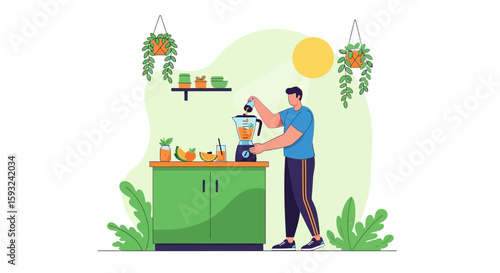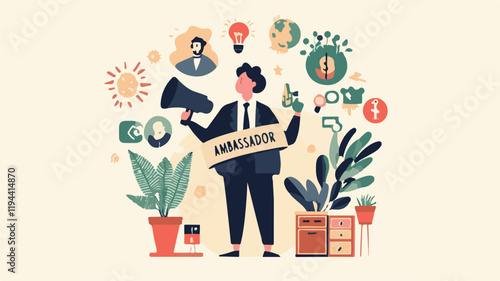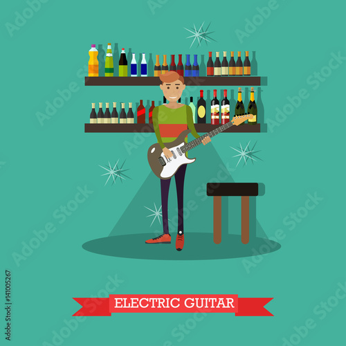 Vektorová ilustrace číšníka nebo baristy držícího menu a hrnek s kávovým nápojem a šlehačkou. Interiér kavárny. Menu koncept plochý styl designový prvek.