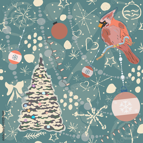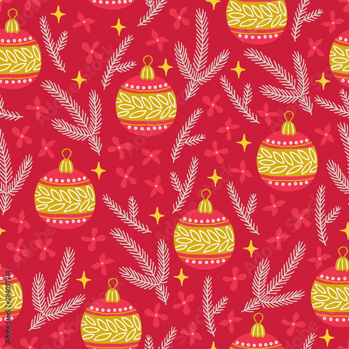 Veselé Vánoce a Šťastný Nový Rok blahopřání a pozadí šablony. Zimní dovolená vektor ilustrace v vintage stylu. Vánoční strom a hračky. 2021 Nový rok ručně kreslený plakát.