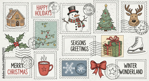 Veselé Vánoce a Šťastný Nový Rok pohlednice šablona. Vektorová sada ilustrací zimní dovolené ve vintage stylu. Vánoční strom a dárky. 2022 Nový rok ručně kreslená plakát.