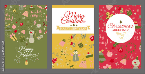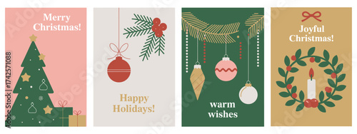Veselé Vánoce a Šťastný Nový Rok blahopřání šablony. Vektorová sada ilustrací zimní dovolené ve vintage stylu. Vánoční strom a hračky. 2023 Nový rok ručně kreslený plakát.