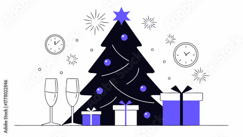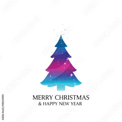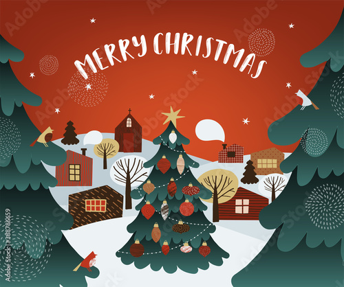 Veselé Vánoce blahopřání vektorové šablony. Vrstvený papír řez styl vánoční strom s zimní noční panorama města uvnitř, sněhové vločky a veselé Vánoce ruční nápisy.