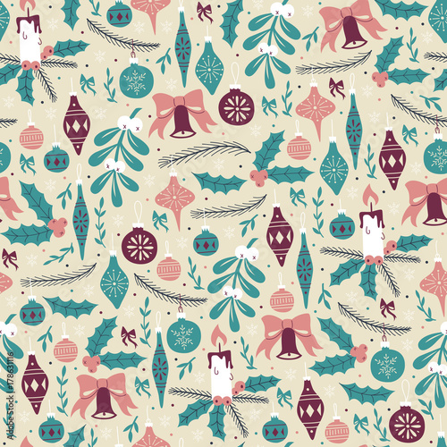 Veselé Vánoce a Šťastný Nový Rok pozadí šablony a banner. Zimní dovolená vektorové ilustrace ve vintage stylu. Vánoční strom a hračky. 2023 Nový rok ručně kreslená karta.