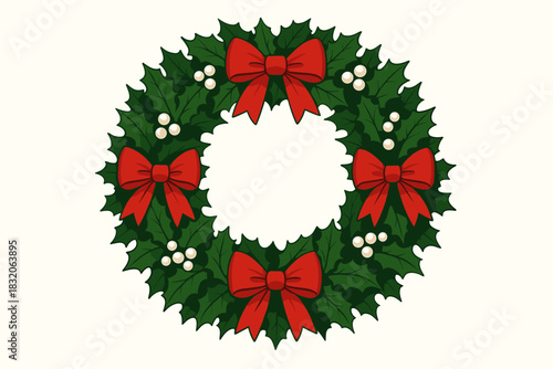 Veselé Vánoce blahopřání vektorové šablony. Papírové vánoční rolničky s lukem, věnec se zelenými smrkovými větvemi, listy cesmíny a červenými květy.