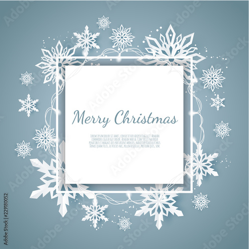 Veselé Vánoce Šťastný Nový Rok vektorové plakát design šablony. Dekorativní rám s papírem řezané sněhové vločky a kopírovat prostor. Vánoční a novoroční svátky pozadí.