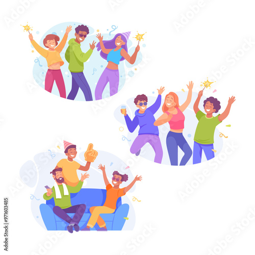 Veselé Vánoce. Šťastní lidé slaví ploché vektorové plakát. Pozdrav text a vzrušená drobná postava ve slavnostním klobouku Santa tančí a baví se ilustrace
